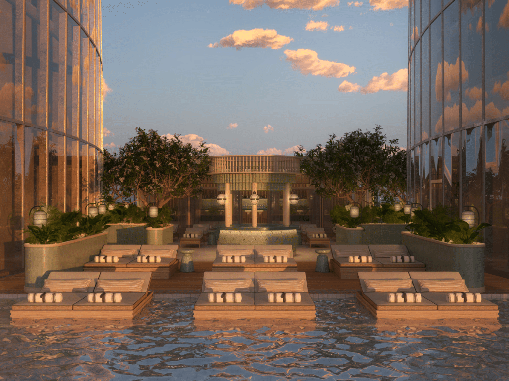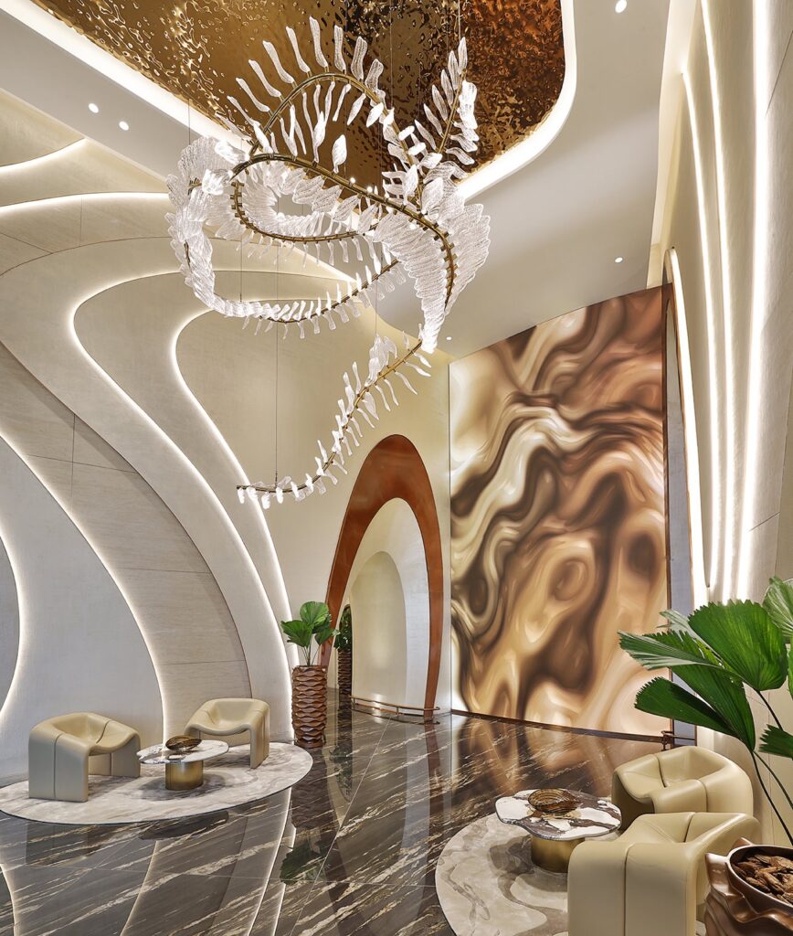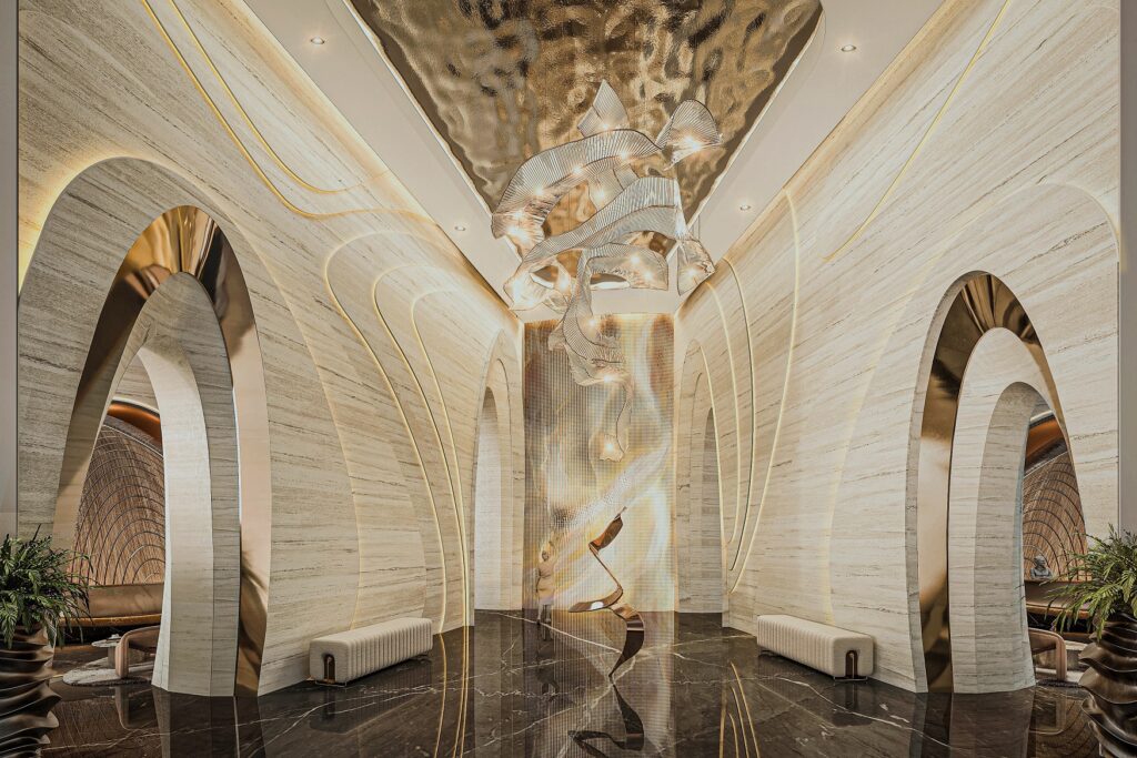 وتتوزع داخل البرج مساحات متعددة للمطاعم، اللاونجات، ومرافق الضيافة المصممة لفكرة “الرفاهية العمودية” — حيث لا تنتقل بين مرافق أفقية، بل تصعد تدريجيًا في تجربة تتغير مع كل طابق.