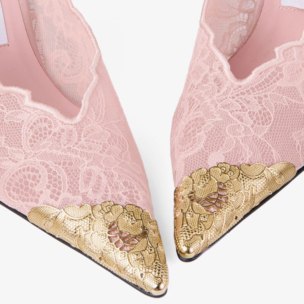 الدانتيل هنا ليس زخرفة سطحية، بل جزء أساسي من هوية الحذاء.