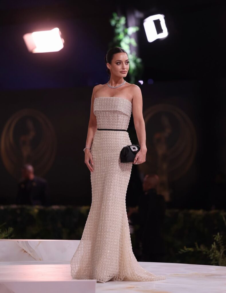 اختارت كارن وازن فستانًا أبيض من إيلي صعب يعكس أسلوبها المعروف بالأناقة الهادئة والدقيقة. القَصّة المستقيمة بدون أكتاف، مع التطريز الناعم المتوازن، منحت الإطلالة طابعًا عصريًا راقيًا بعيدًا عن المبالغة. الحزام الأسود الرفيع أضاف تحديدًا بصريًا ذكيًا لكسر أحادية اللون، بينما حافظت الإكسسوارات البسيطة على نقاء الإطلالة.