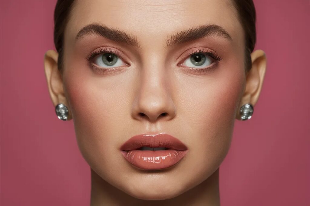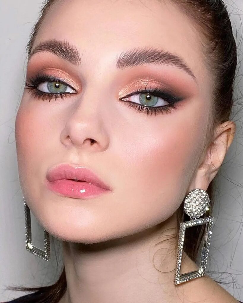 العيون بتدرّجات الخوخ، الشفاه الوردية الطبيعية، والبلاشر الخفيف على أعلى الوجنتين.