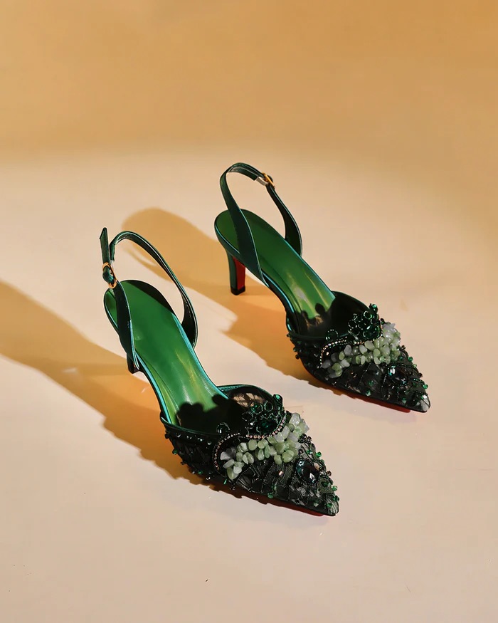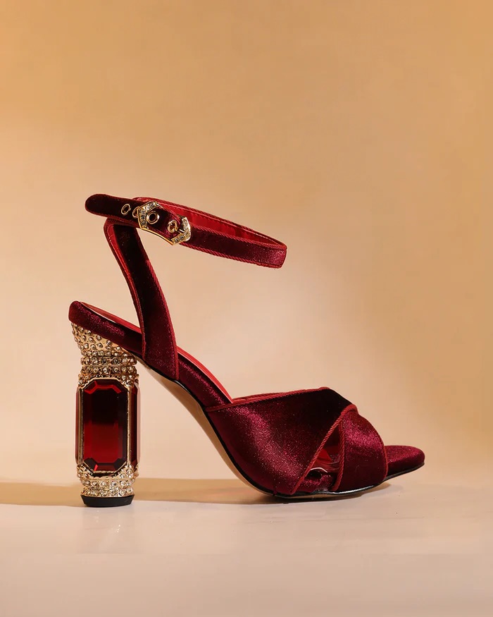حذاء مخملي بلون أحمر عميق، مع كعب مزخرف بالكريستال يضيف لمسة فاخرة دون مبالغة.