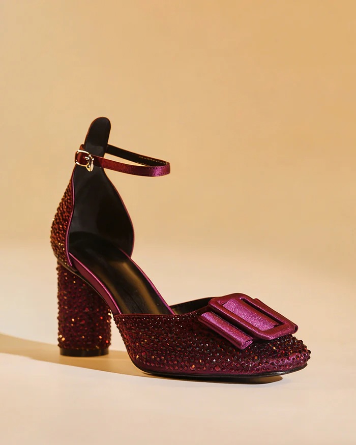 لون خمري غني، كعب ثابت، وتفصيلة إبزيم أنيقة تضيف شخصية للتصميم.